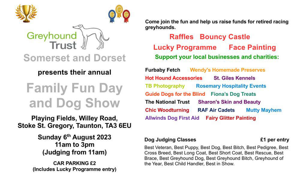Fun day for dogs as well as humans. Support local charities and local businesses. All funds to our local Greyhound Trust branch helping re-home ex-racing dogs.