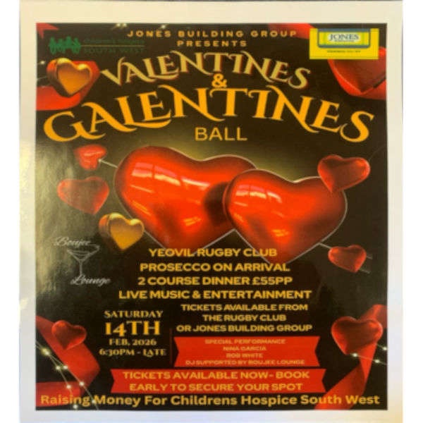 Organised by Jones Building Group in support of Children's Hospice South West. It includes a two course dinner, glass of Prosecco on arrival, two course dinner, live music, and entertainment. Saturday, 14th February (Valentines Day) at Yeovil Rugby Club, 6.30 pm till late. Tickets can bought at Yeovil Rugby Club or from Jones Building Group.