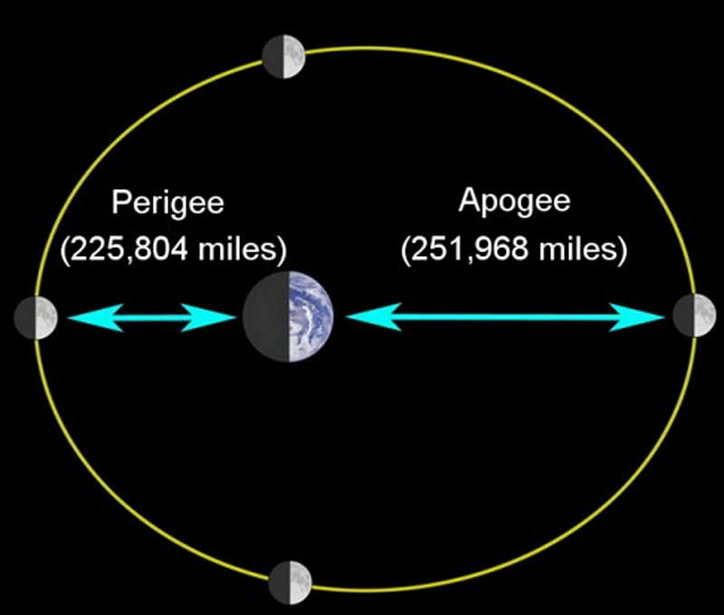 In astronomy, there is no such thing as a perfect circle and all objects' orbits are elliptical (or egg-shaped) to a greater or lesser degree. In the case of our Moon, at perigee our natural satellite is approximately 225,000 miles away from us, where at the opposite point in its orbit, known as apogee, it is more like 251,000 miles away. This cycle repeats every 27 days, which is how long the Moon takes to go around us.