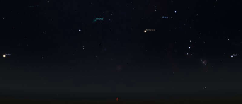 If you go outside from around 11pm. Orion will have risen above the horizon to the east and the radiant point of the shower will be a little to the left of the red giant star Betelgeuse. While you are waiting for those streaks of light to appear, further to the left, Jupiter will be easy to spot.
