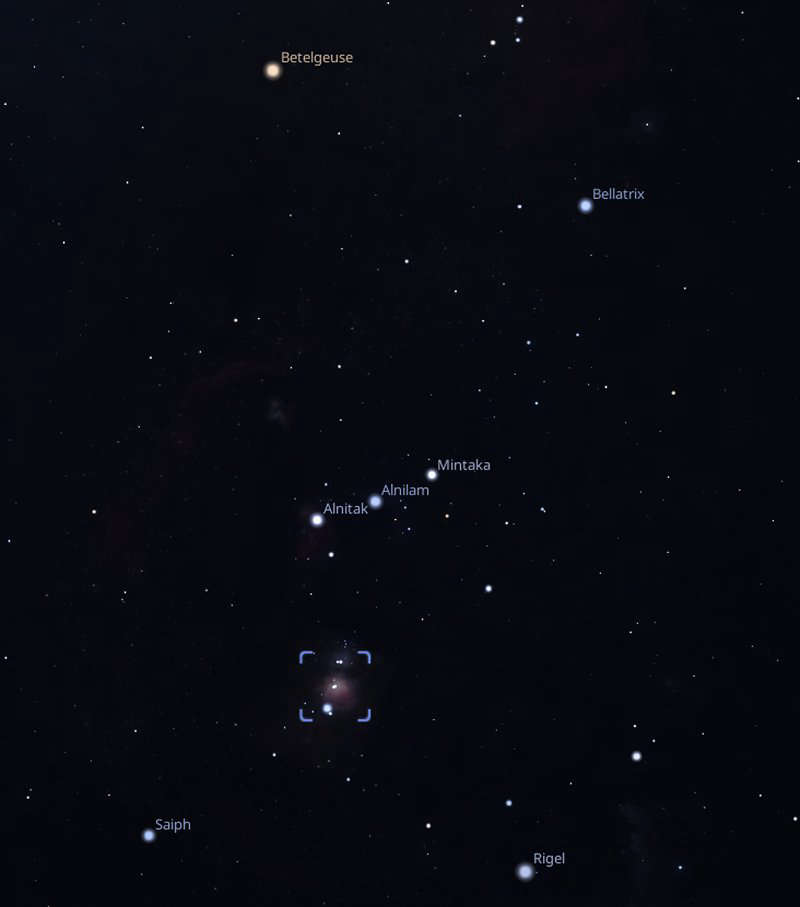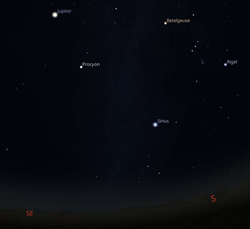 If at the same time, you look to the right of Jupiter and a little below it, you will be able to see the bright star, Procyon and the brightest star in the night sky, Sirius. To the right of them, the constellation of Orion will be easy to find.