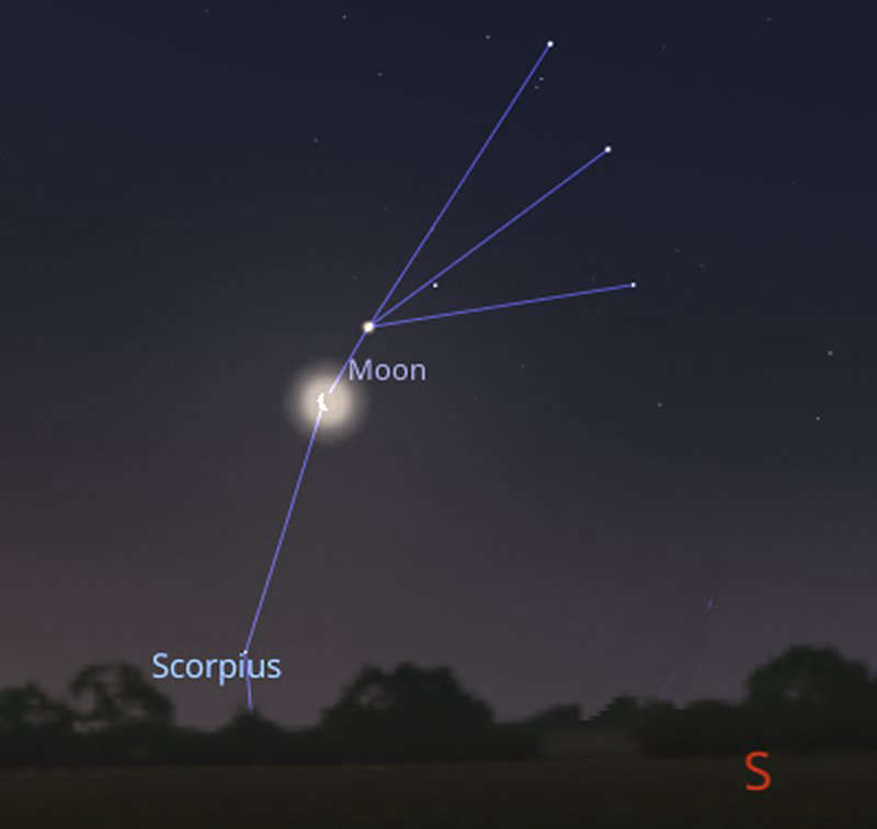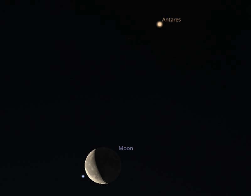 If you would prefer a morning activity, look towards the south at 6am on Wednesday 11th to see a 33%-lit waning crescent Moon occulting (or passing in front of) a magnitude +2.8 star in the constellation of Scorpius. At the same time, the bright red giant star Antares will be visible above the Moon, shining at a magnitude of +1.7