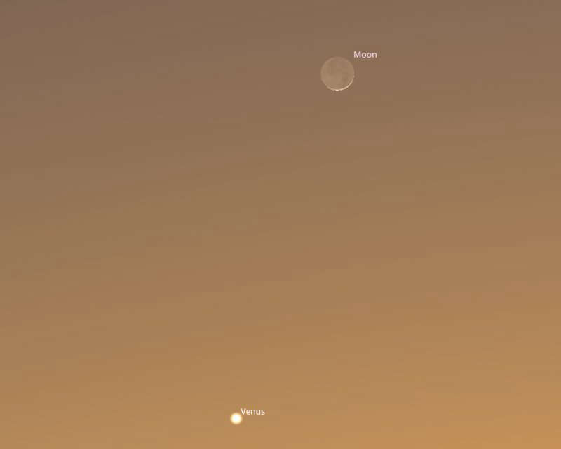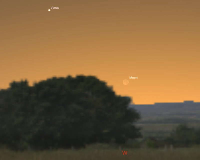 Moving on a day to the same time on Friday 20th, the Moon will now appear as a thin 3%-lit waxing crescent and because of the way it orbits around us, the Moon will now be a little above and to the right of Venus as the pair set below the western horizon.